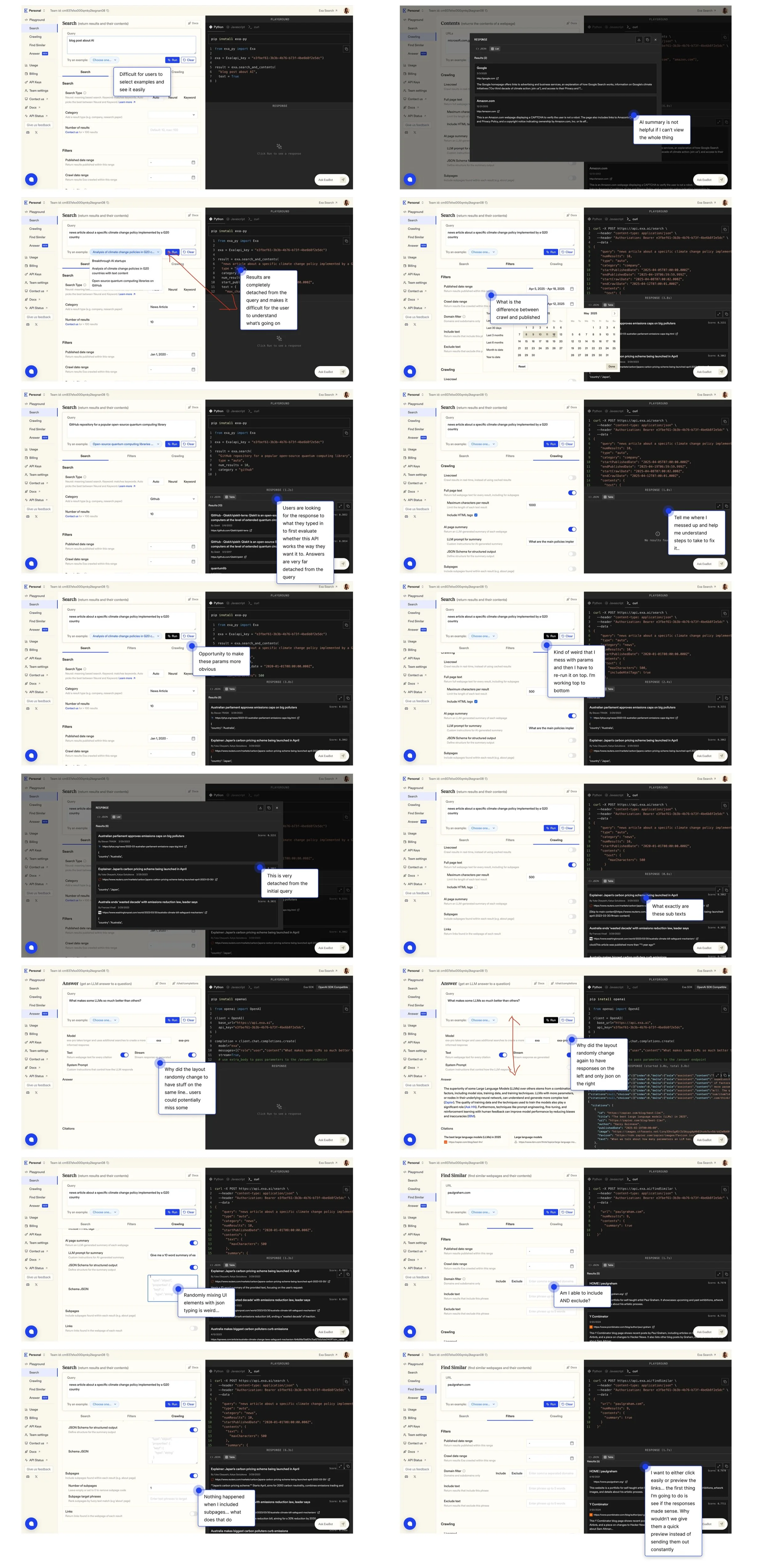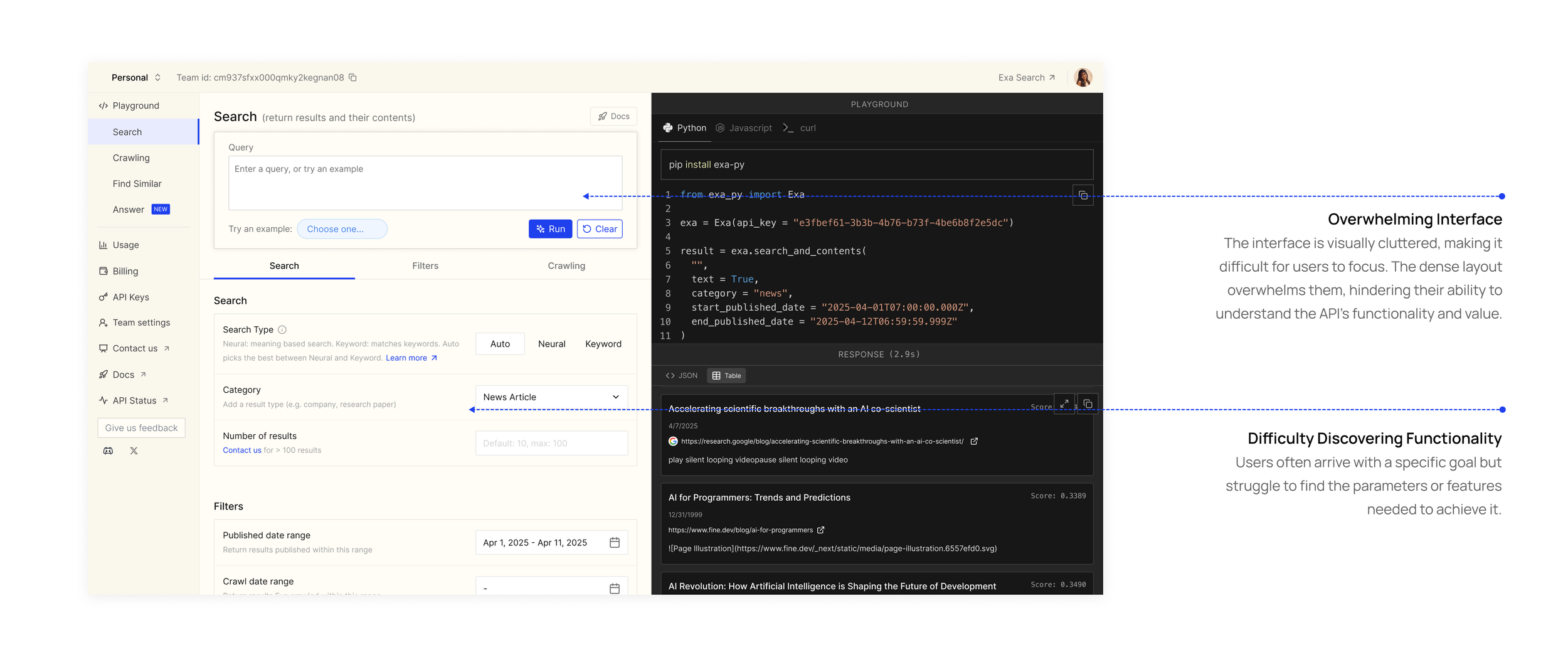 A developer’s current process to evaluate an API does not map well to Exa’s current setup on the app.