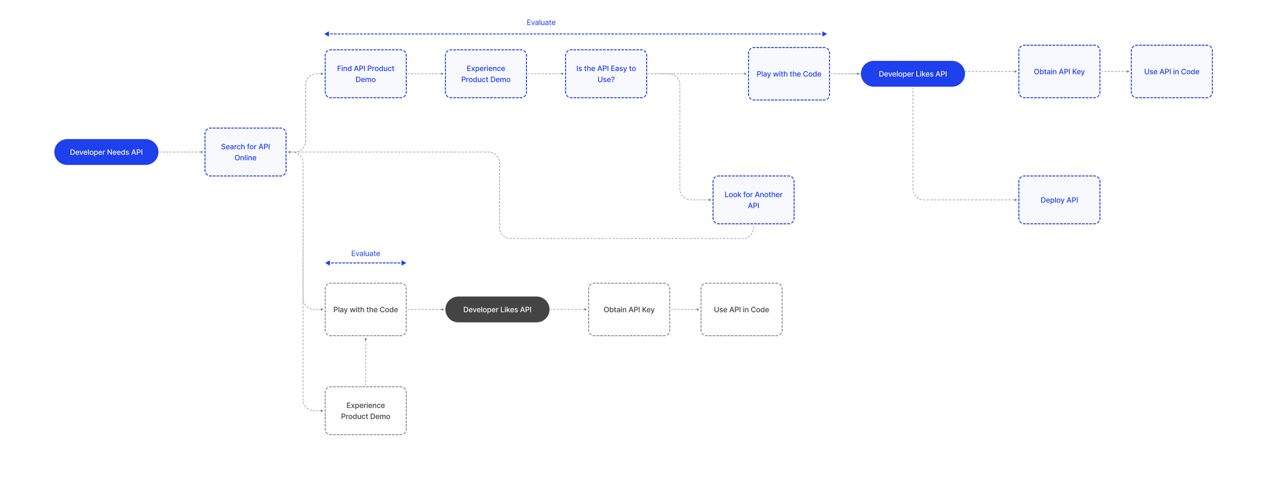 Initial Evaluation Flow: All personas—especially non-technical ones like execs—start by running a query to see the API in action. Many stop here and pass evaluation responsibilities to developers. Developers then dive deeper into code.