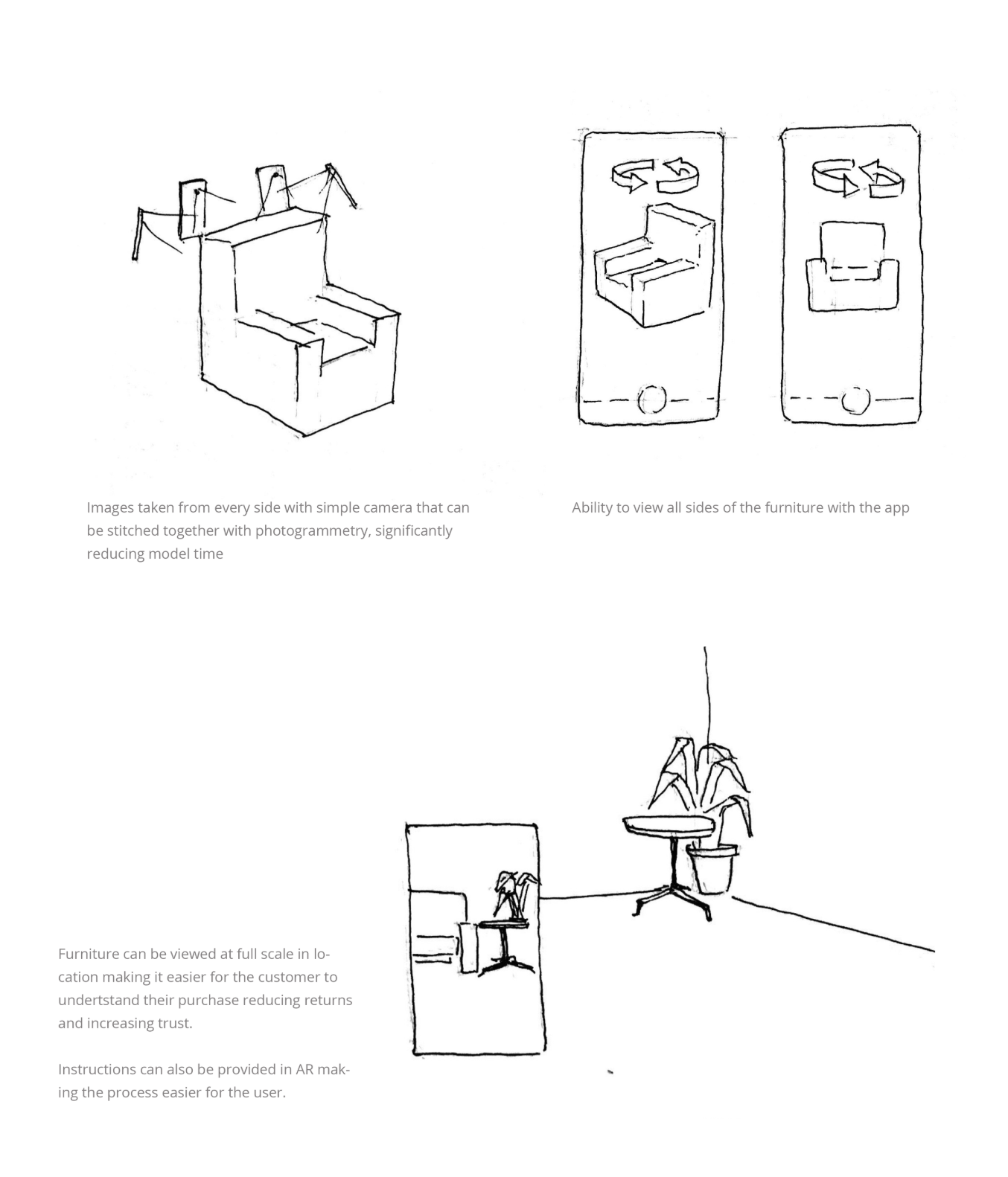 We wanted to move the power of creating AR objects to the user using Photogrammetry. The seller captures the object by photographing it from multiple views. The app then uses photogrammetry to compare similar points or feature points on the object and stitch it together as a 3D object with textures pre mapped from the images. The buyer then uses the AR object to compare the object in context.