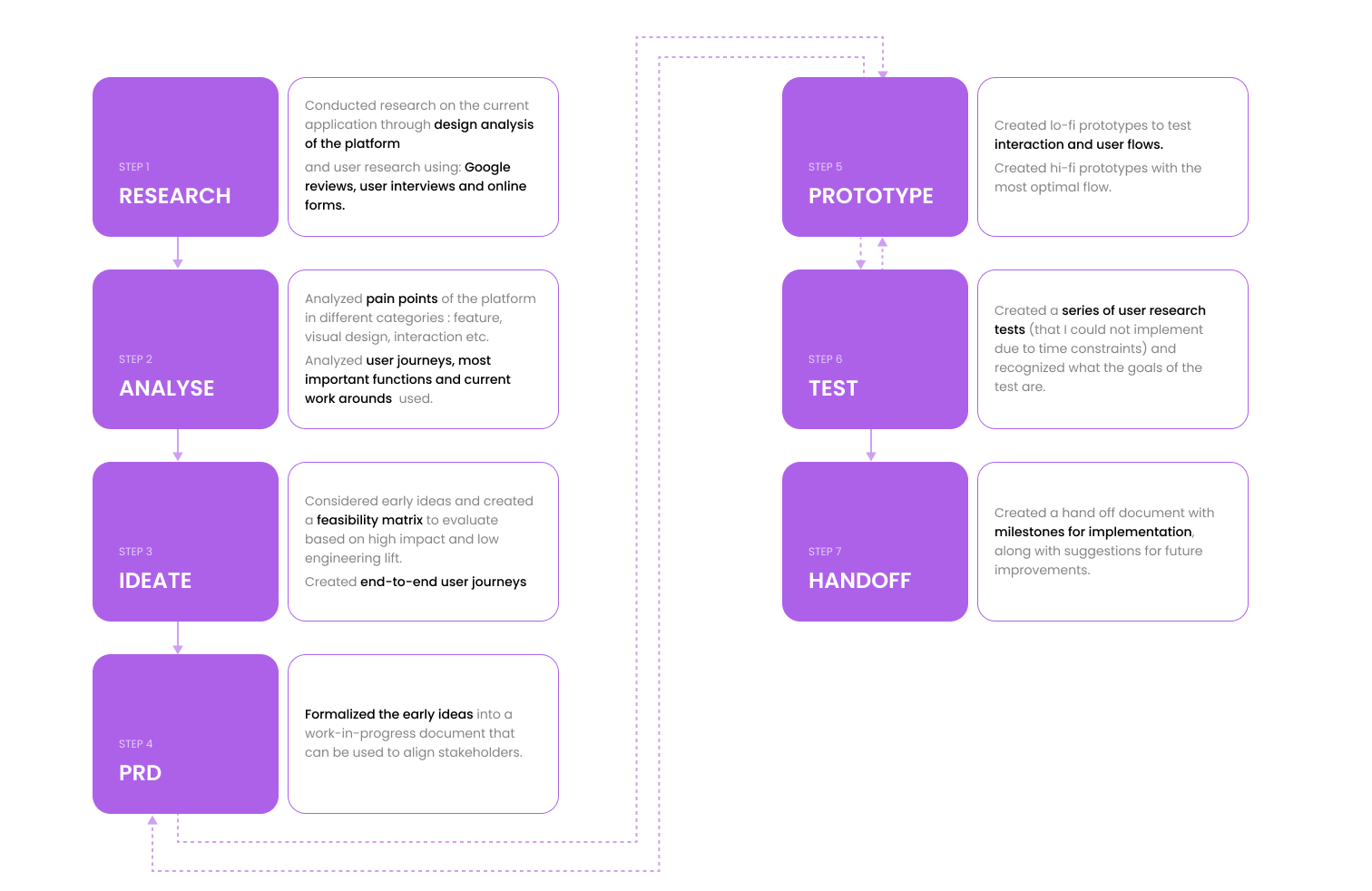 I needed to understand WHY the users needed to find workarounds to understand where the areas of inefficiency were on the platform, as well as what the areas of opportunity. I studied the platform to from different angles - visual design, UX writing, areas for feature additions, IA (specifically, how can different parts of the platform be positioned to allow better discoverability).