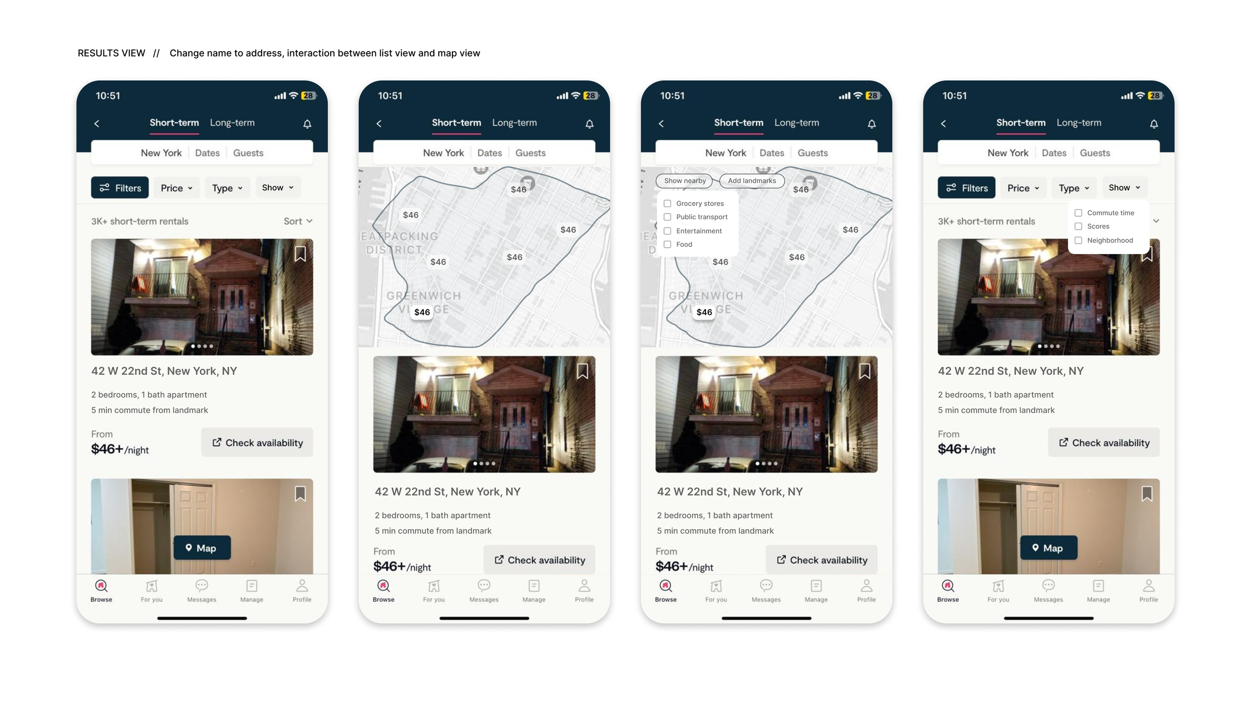 Pain point #3 - Understanding all location factors seamlessly in results page is difficult due to current information architecture and interaction of list view, map view and detail view and where the information lives.